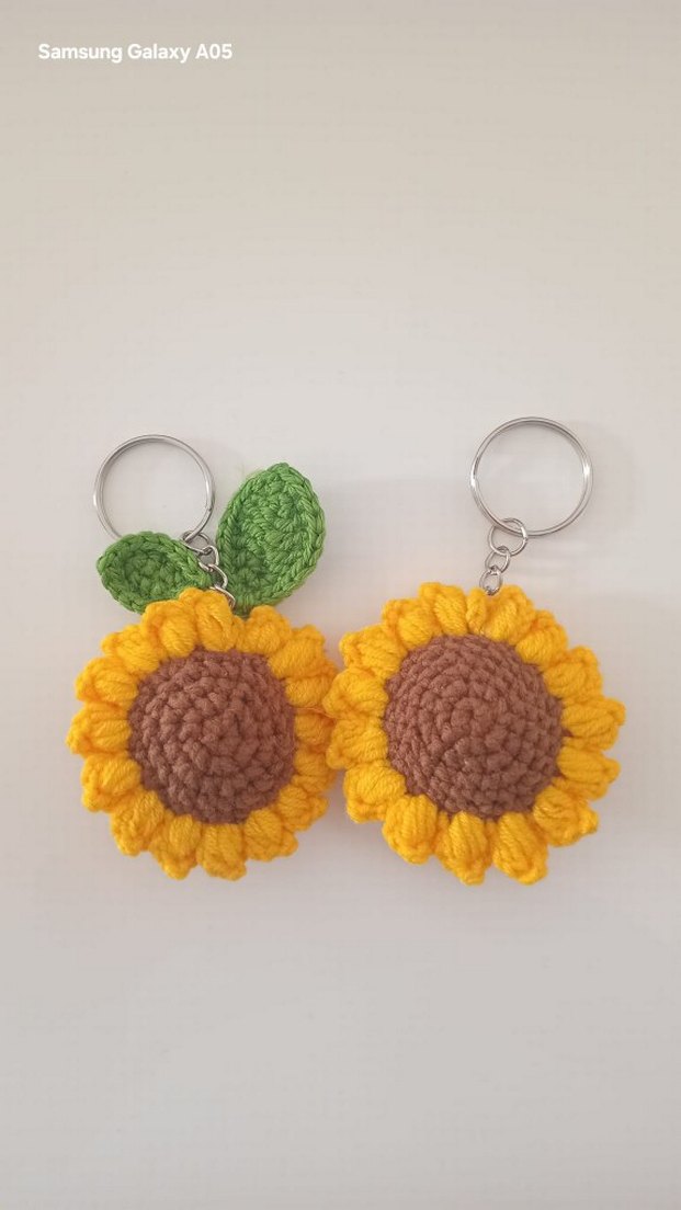 Örgü sarı ayçiçeği anahtarlıklar, rahat ve renkli bohem tarzda. Detaylı yaprak ve taç yaprakları bulunur.