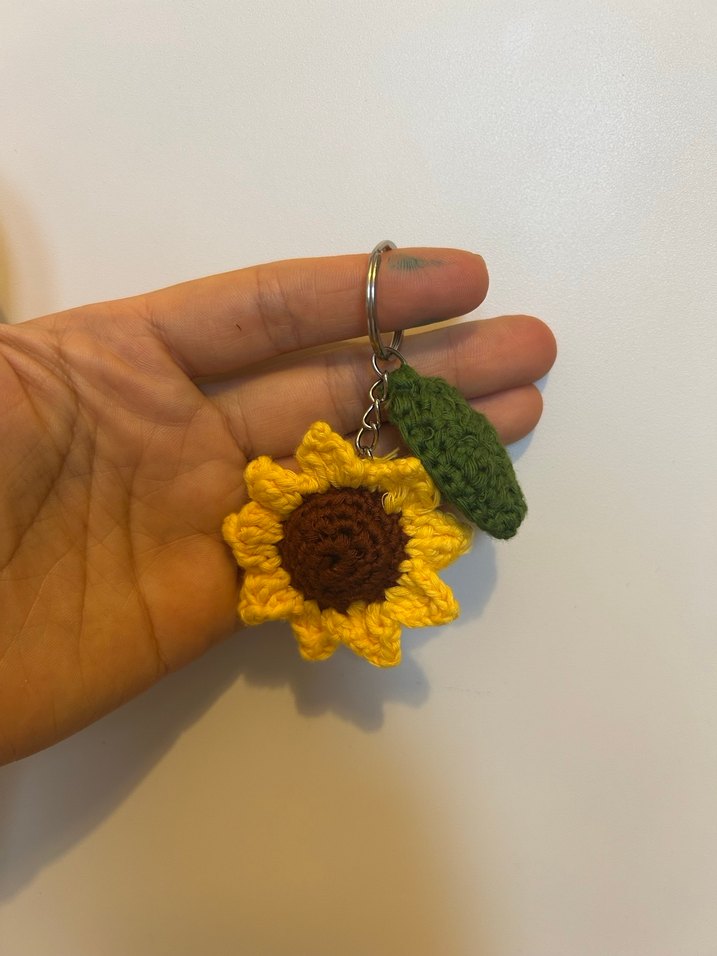Renkli, örgü ayçiçeği ve yeşil yaprak detaylı, rahat bohem tarzda anahtarlık.