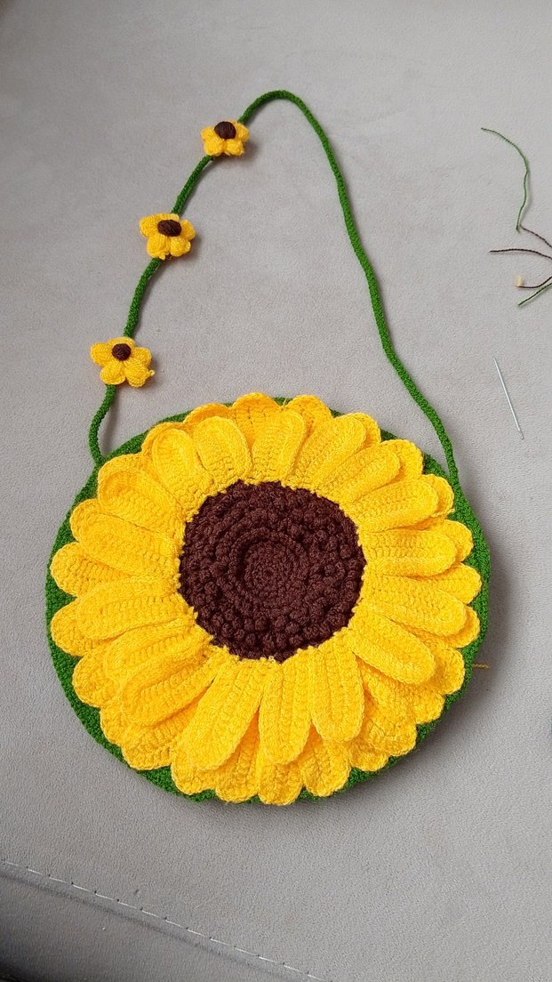 Canlı sarı ve kahverengi renklerde, çiçek desenli örgü ayçiçeği tasarımlı bohem tarzı kadın çocuk çantası, yeşil askılı. her yaşa uygun dur