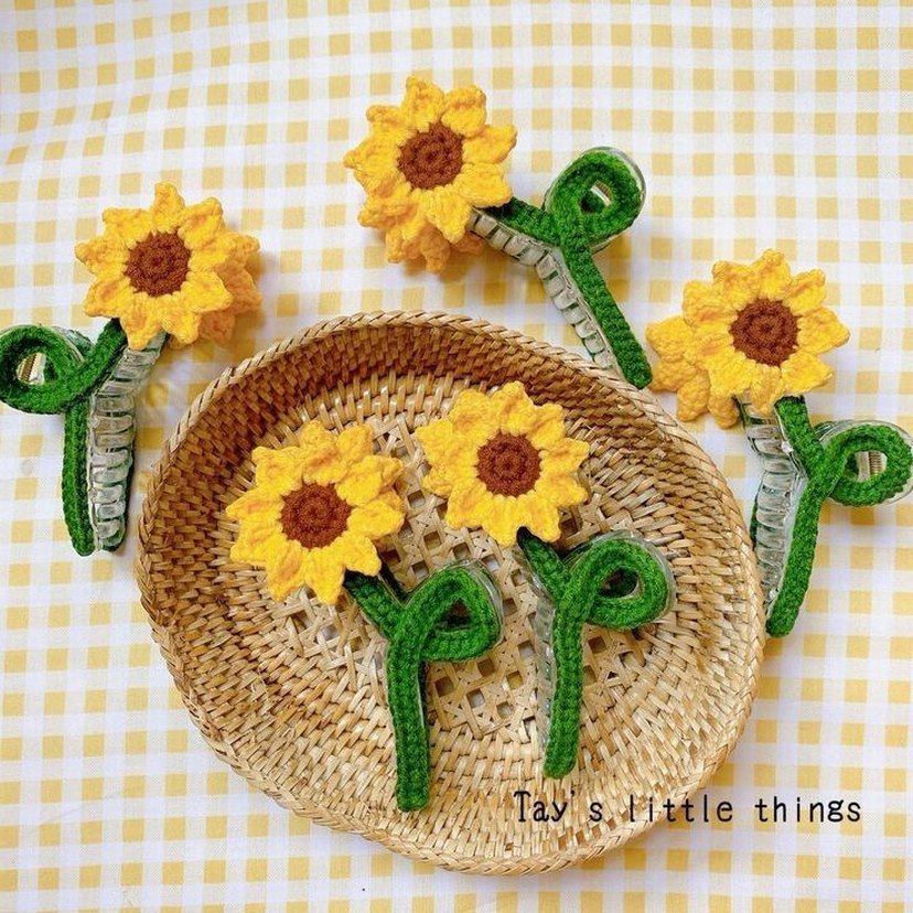 Örgü sarı ayçiçeği saç tokaları, yeşil saplı, renkli çiçek desenli bohem tarzda