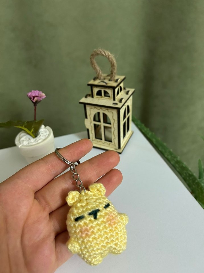 Bu açık sarı anahtarlık, örgü ayıcık tasarımına sahip olup rahat, bohem tarzı yansıtır. Hippie ve retro stillere uygundur.