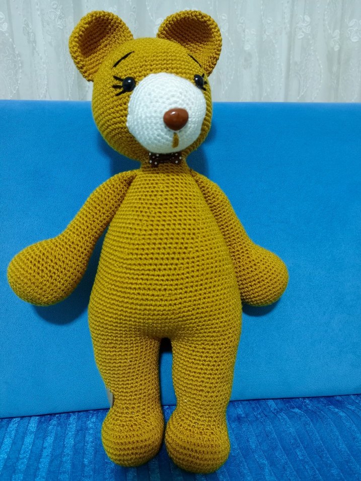 Sarı renkli, örgü dokulu peluş ayıcık, yumuşak yapısı ve detaylı işçiliğiyle renkli ve sevimli bir oyuncaktır.