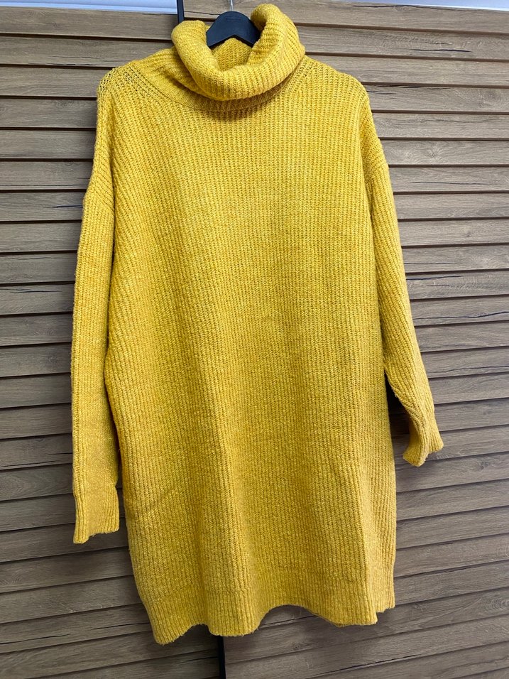 Sarı örgü kadın kazak, balıkçı yaka ve uzun kolludur. Rahat kesimi ve midi boyu ile günlük kullanıma uygundur.