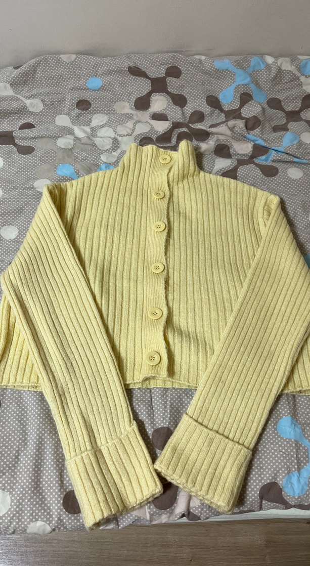 Fitted kesim, sarı örgü kazak, boğazlı yaka ve uzun kolludur. Normal boyda, düğmeli ve rahat günlük kullanıma uygundur.