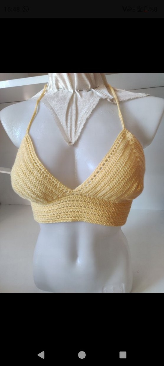 V yaka ve ince askılı, sarı renkli örgü bohem tarzda, günlük kullanıma uygun oturmalı büstiyer.