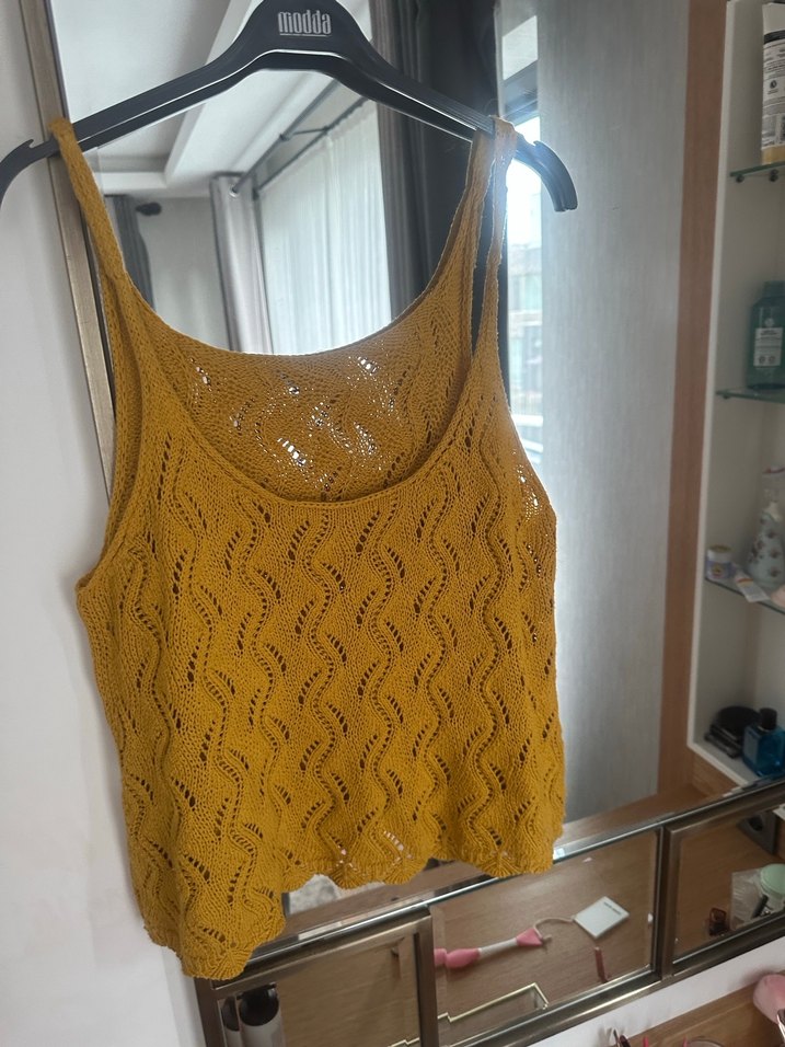Sarı renkli, örgü kumaştan yapılmış, askısız ve kolsuz, bol kesim bohem tarzı kadın atlet. Parlak dokusu ile dikkat çekiyor.