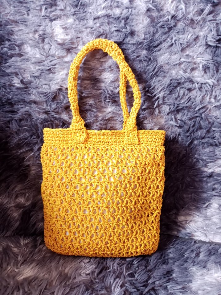 Sarı örgü kadın çanta, dantel detaylı, rahat ve bohem tarzda, günlük kullanıma uygun.
