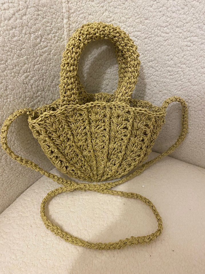 Hafif sarı renkli, örgü bohem tarzında, yuvarlak saplı ve uzun askılı kadın çantası. Kendi el örgüm