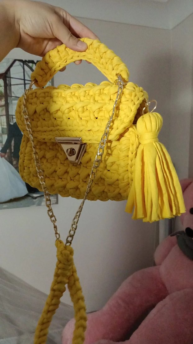 Sarı örgü kadın çanta, püskül detaylı ve bohem tarzda, desenli ve altın zincir askılı. Günlük kullanıma uygun.