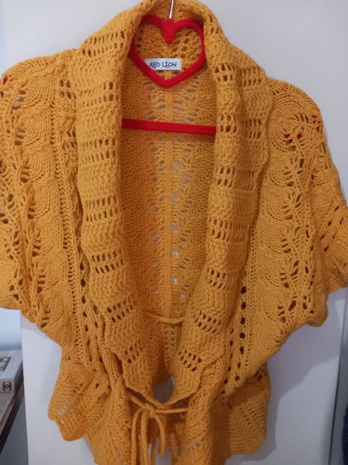 Sarı renkli, örgü bohem kadın hırka. Salaş kesim, kayık yaka ve renkli nakış detaylarıyla günlük kullanıma uygun, rahat bir modeldir.