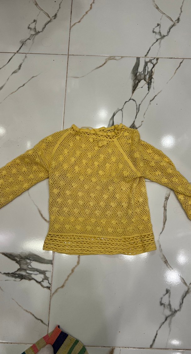 Sarı renkli, uzun kollu ve yuvarlak yakalı bu örgü kazak, bol kesimi ve bohem tarzıyla rahat bir dış mekan görünümü sunar.