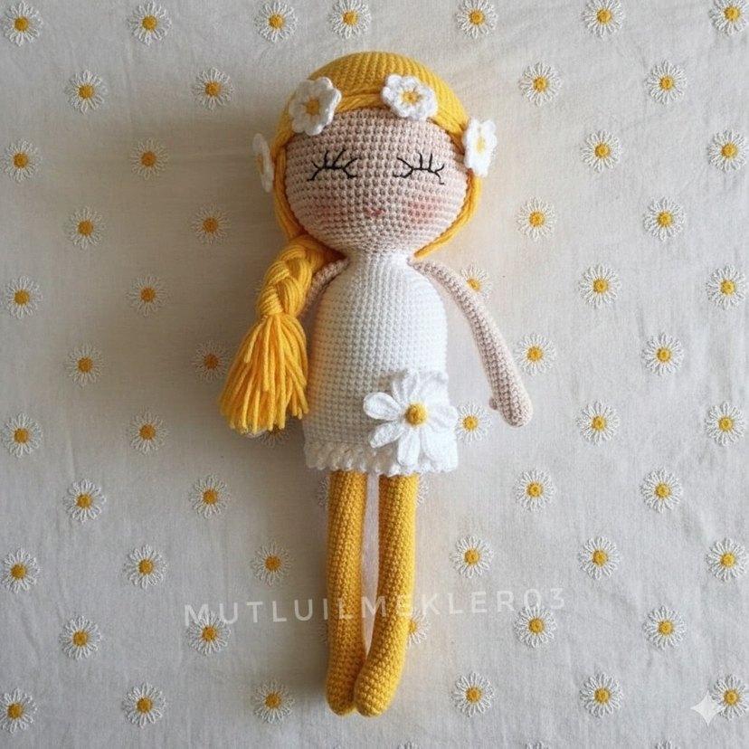 Pastel sarı renkli, beyaz çiçek detaylı, gözleri kapalı örgü bebek.