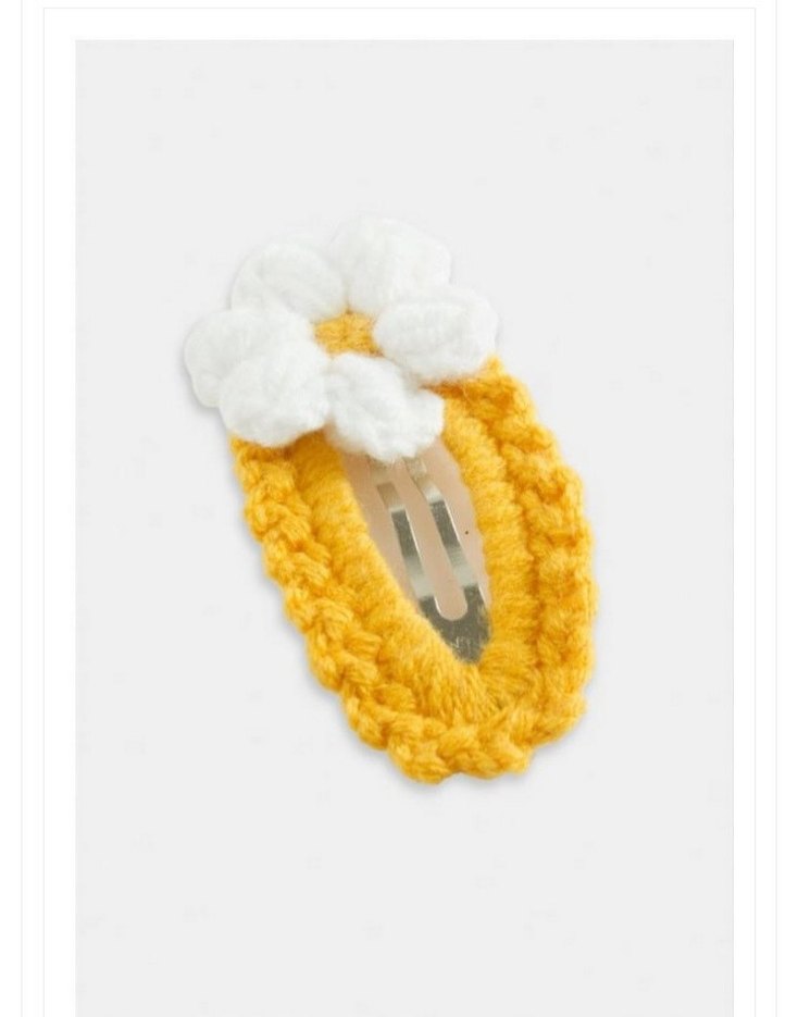 Sarı örgü yapıda, nakışlı beyaz çiçek detaylı, bohem tarzda çocuk saç tokası.