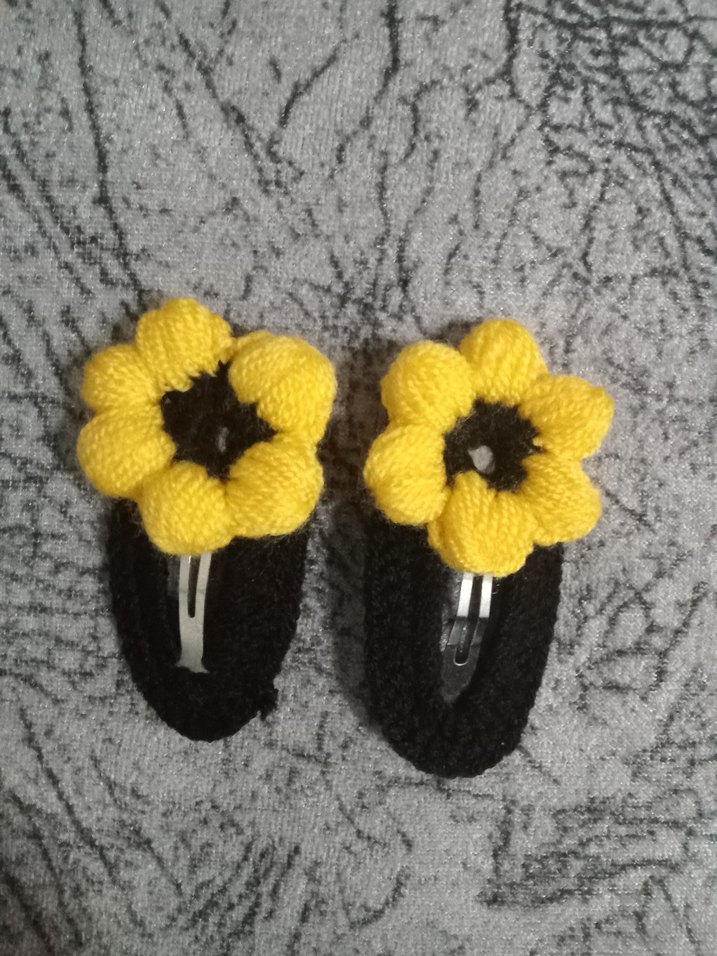 Siyah tabanlı, canlı sarı çiçek desenli örgü çocuk saç tokası seti, sade ve renkli tarzda.