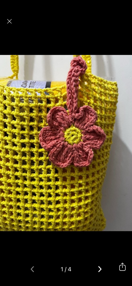 Sarı örgü kumaştan yapılmış, pembe çiçek detaylı, renkli ve bohem tarzda kadın çantasıdır.