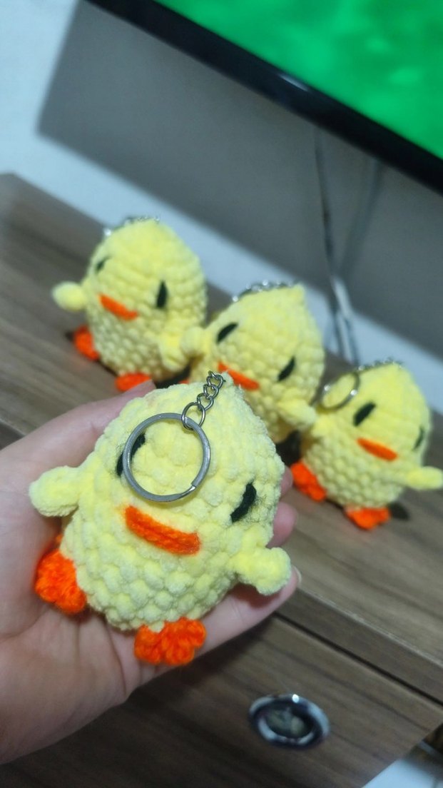 Renkli, sarı örgü civciv figürlü anahtarlık, turuncu ayakları ve metal halkasıyla anahtarlarınıza sıcak ve eğlenceli bir dokunuş katar.