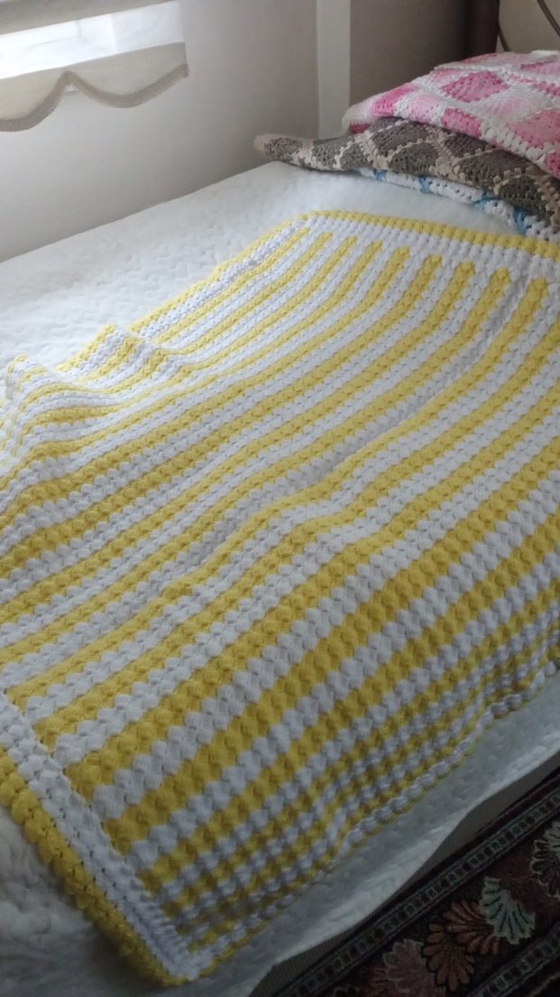 Yumuşak örgü malzemeden yapılmış, açık sarı ve beyaz çizgili çocuk battaniyesi, sıcaklık ve konfor sağlar.
