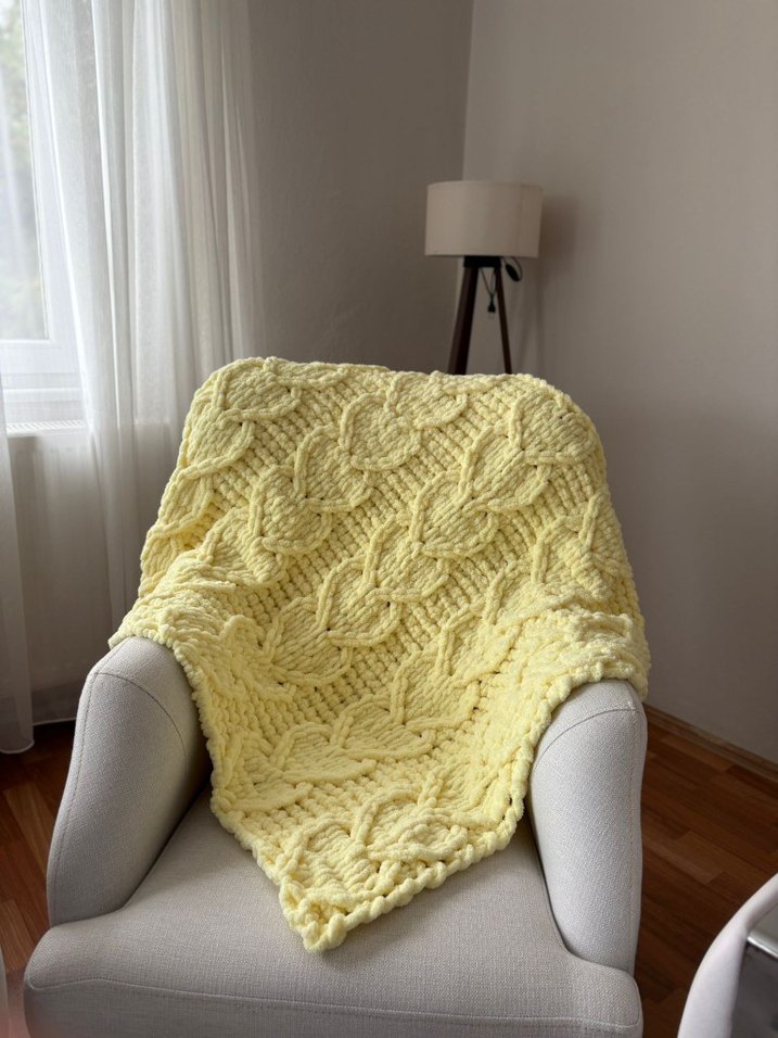Yumuşak dokulu, açık sarı renkli örgü çocuk battaniyesi.