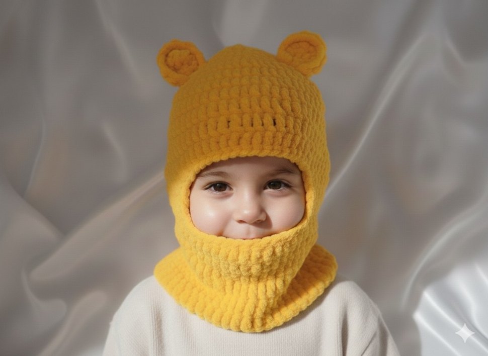 Yumuşak kumaştan örülmüş, nakış detaylı sarı çocuk bere ve boyunluk, sıcak tutar.
