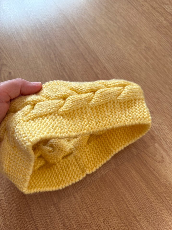 Sarı renkli, örgü çocuk bere, rahat ve bohem tarzda sade bir görünüm sunar. Yumuşak ve konforlu dokusuyla günlük kullanıma uygundur.