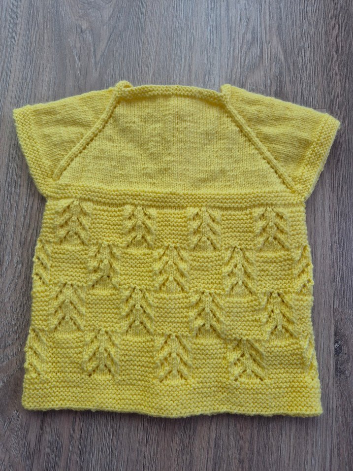 Sarı renkli, örgü süveter. Kısa boy, kolsuz, yuvarlak yaka ve dokulu desene sahip. Günlük kullanım için uygun, bohem tarzda, vücuda oturan model.
