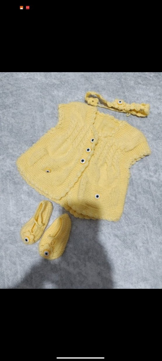 Pastel sarı, örgü çocuk süveteri, kolsuz ve bol kesimlidir. Aynı renkte örgü ayakkabı ve saç bandı ile birlikte gelir.3 4 kez giydirdim patik ve sac bandi hic kullanilmadi
