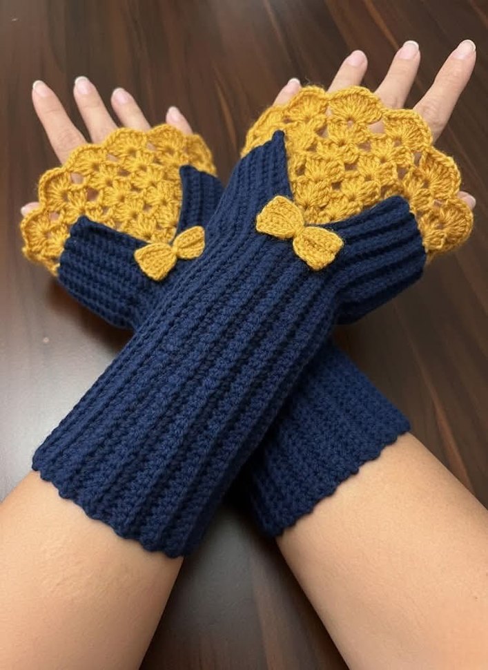 Kadınlar için örgü eldiven, sarı tığ işi detaylar ve küçük fiyonk ile bohem tarzda. Lacivert eldivenler, renkli sarı vurgular içerir.