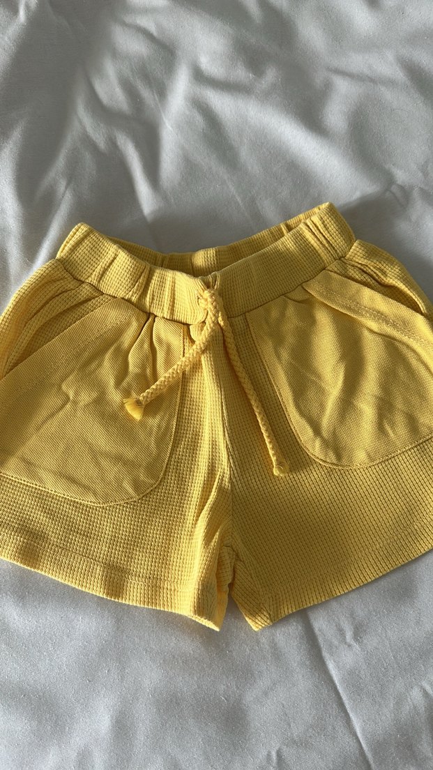Sarı renk, örgü dokulu, bol kesim kız şortu, bağcıklı bel detayına sahip, sade ve normcore tarzda.
