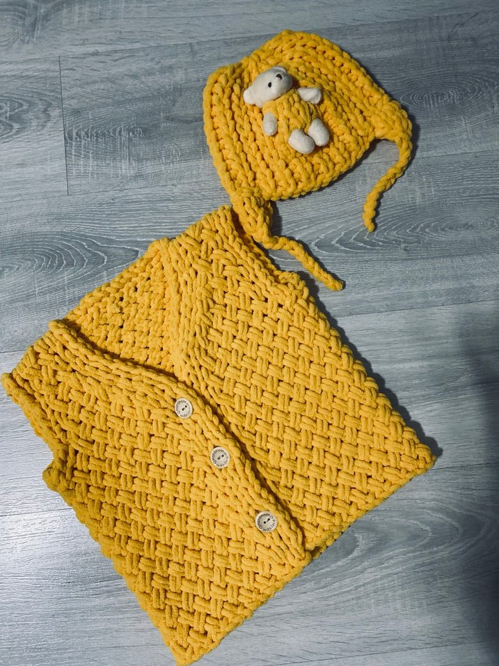 Sarı örgü kısa hırka ve kapüşonlu bere, küçük peluş oyuncak detaylı. Rahat kesim ve kolsuz, bohem tarzda sıcak bir set.