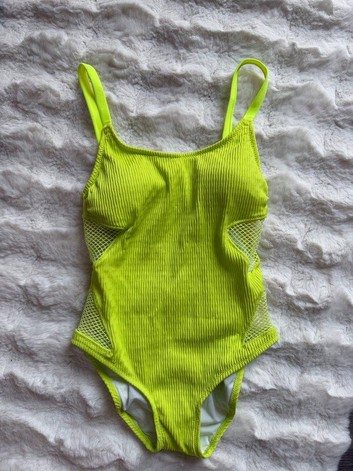 Sarı renkli, örgü dokulu, ince askılı ve yanlarda file detaylı kadın mayo, plaj ve sokak stiline uygun.