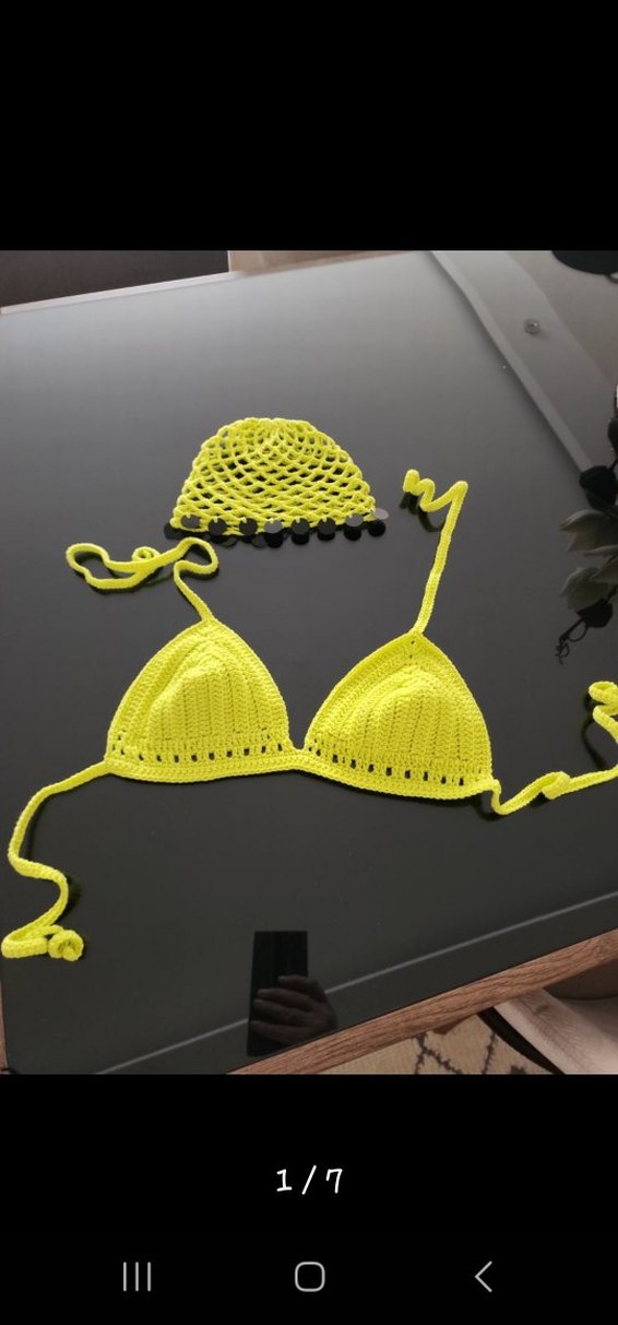 Sarı örgü ipli bikini takımı, mini boy ve sıkı kesim, yanında uyumlu örgü şapka ile bohem plaj stiline uygun.