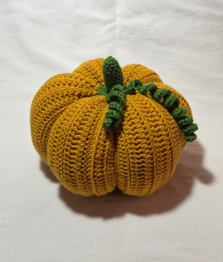 Sarı örgü kabak şeklinde, yeşil kıvrımlı detaylara sahip yumuşak dokulu süs. Ürün el yapımıdır. Marka temsilidir.