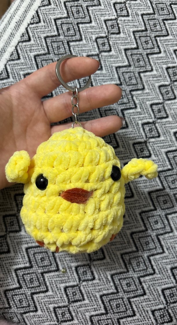 Renkli sarı örgü tasarıma sahip, küçük civciv şeklinde yumuşak dokulu rahat bir kadın anahtarlığı.