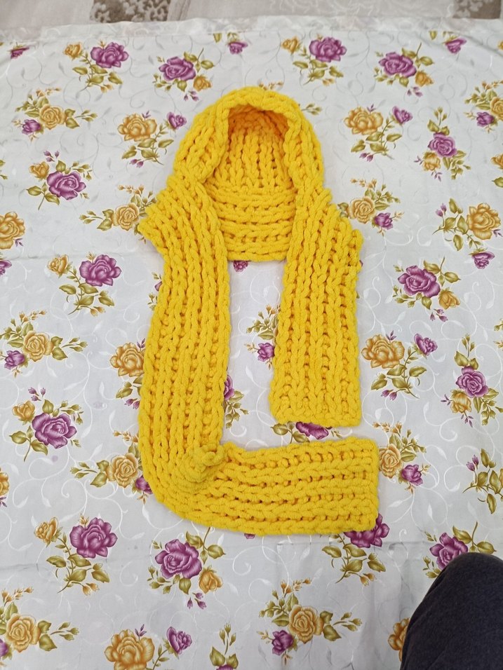 Sarı renkli, kalın örgü dokusuyla bohem tarzda, rahat ve renkli kadın Atkısı.