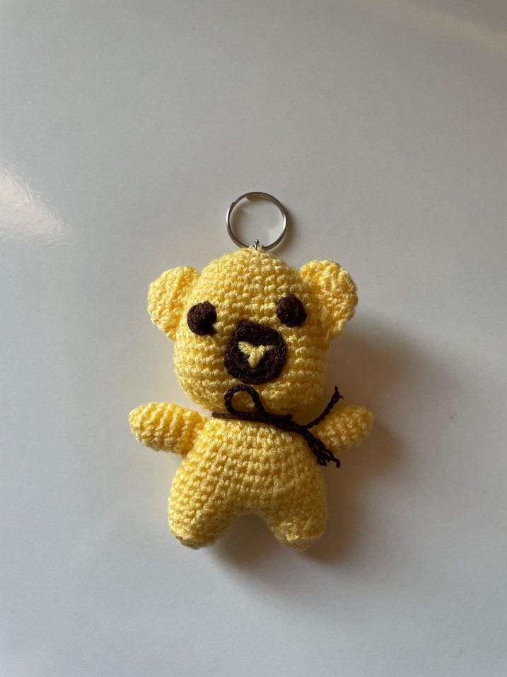 Renkli, örgü sarı ayıcık anahtarlık, sade ve rahat tasarıma sahip. Yumuşak dokulu ve günlük kullanıma uygun basit stil.