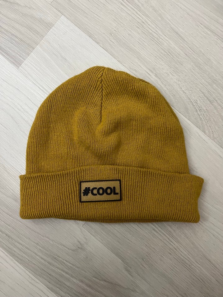 Yün örgü, sarı renkte kadın bere, #COOL etiketi ile. Trendy günlük sokak stili için yumuşak ve sıcak.