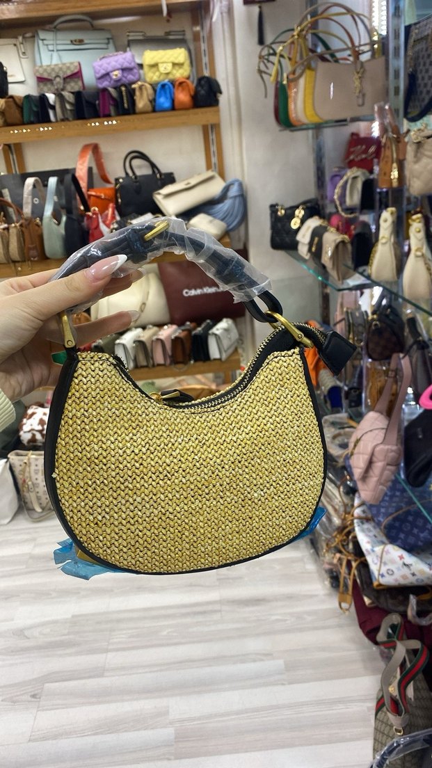 Sentetik kumaştan, parlak yılan desenli sarı örgü kadın çanta. Bohem tarzda, günlük kullanım için uygun.