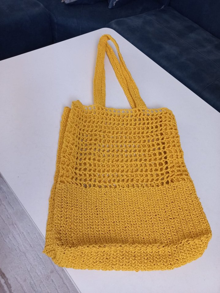 Yumuşak örgüden yapılmış, bohem tarzda sarı örgü kadın çanta. Günlük kullanım için uygun, desensiz tasarıma sahiptir.