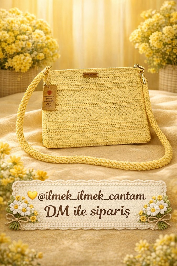 Clach bohem tarzda sarı örgü kadın çanta. Rahat ve günlük kullanıma uygun.