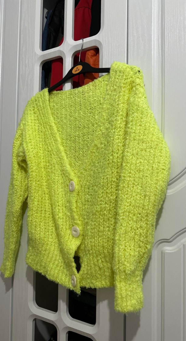 Sarı renkte, örgü kumaştan, rahat kesim ve uzun kollu kadın hırka. Midi boyda, crew yaka ve günlük sokak stili için uygun.