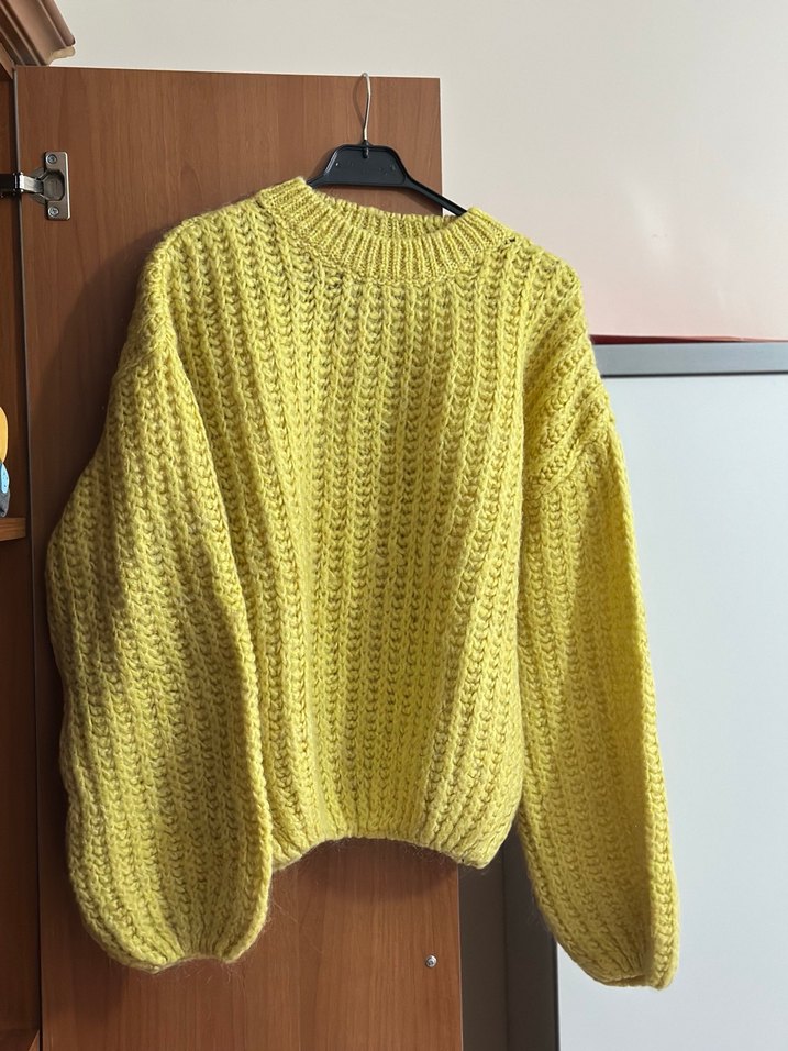 Pastel sarı örgü kazak, yuvarlak yaka ve uzun kollu, bol kesimiyle rahat ve sade bir sokak stili sunar.