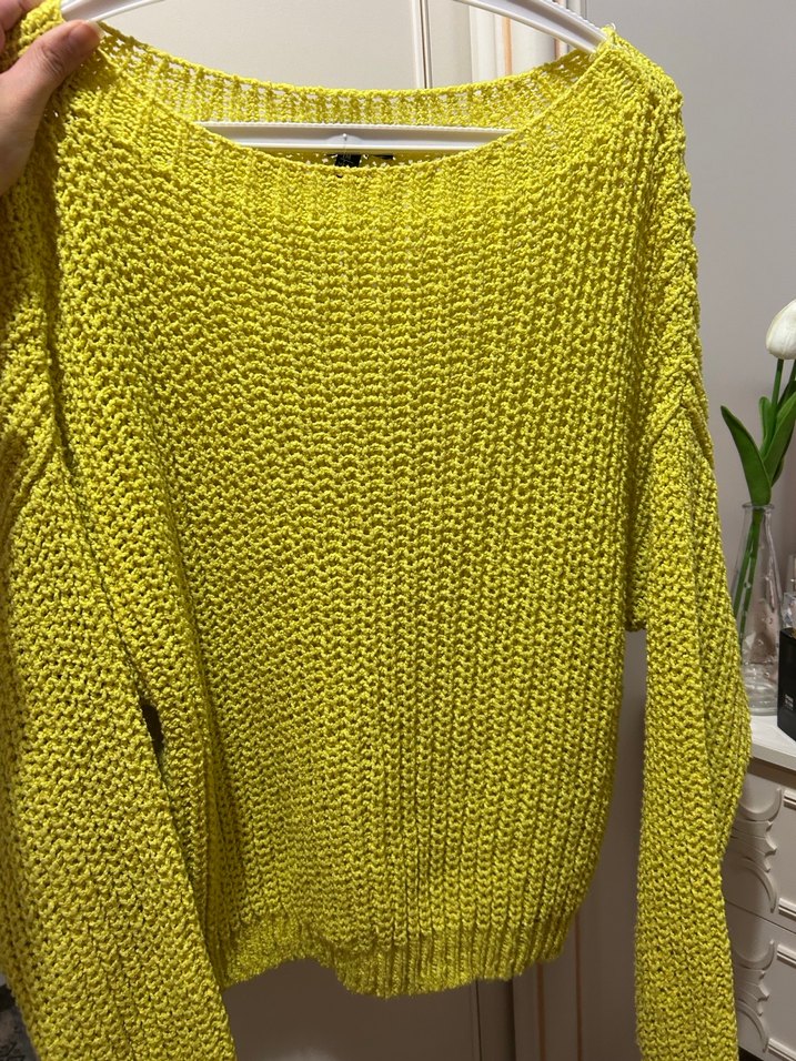Yumuşak örgü kumaştan yapılmış, uzun kollu, normal boy, bol kesim sarı kadın kazak. Düz ve parlak renkte, günlük kullanıma uygun.
