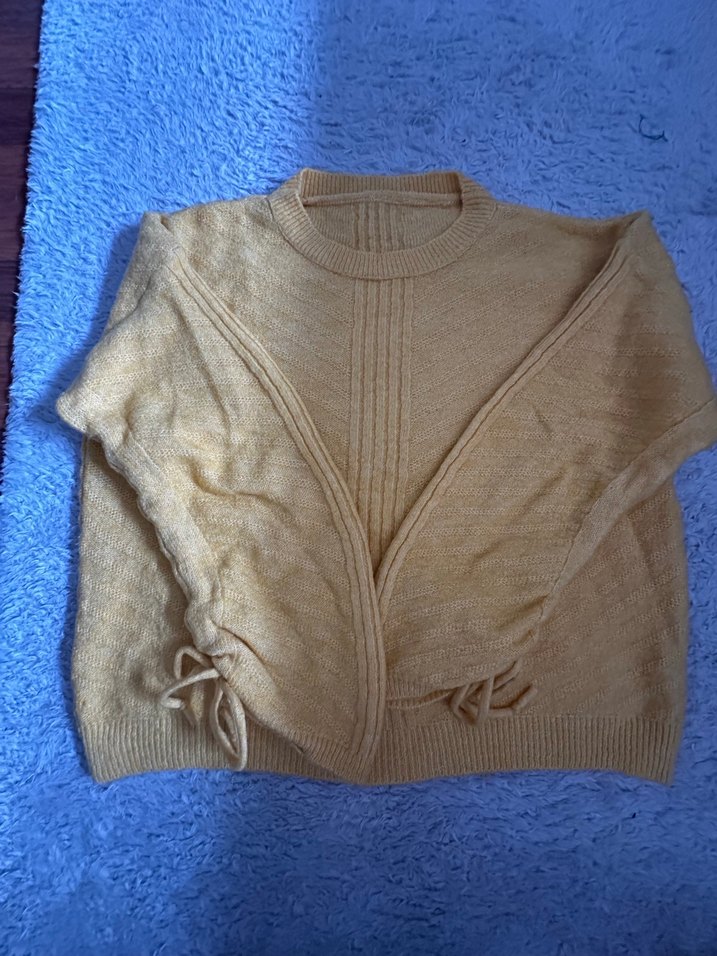 Sarı renkli, örgü kadın kazak, yuvarlak yaka ve uzun kollu. Rahat kesimi ve günlük sokak stili ile kullanıma uygundur.