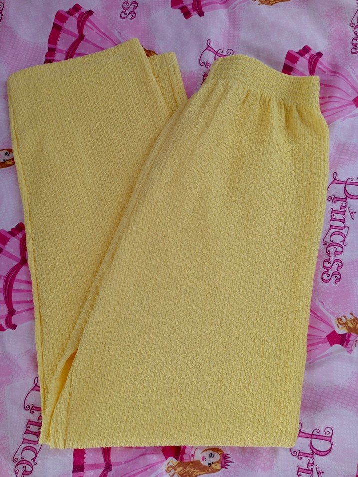 Sarı renkli, örgü dokulu keten kumaştan, midi boy ve bol kesim kadın pantolonu. Rahat ve günlük kullanıma uygun.