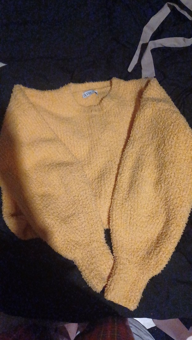 Sarı örgü kadın kazak, yumuşak ve sıcak kumaş, uzun kollu ve bisiklet yaka. Rahat kesim ve normal midi boyda, günlük kullanım için uygun yumusacik