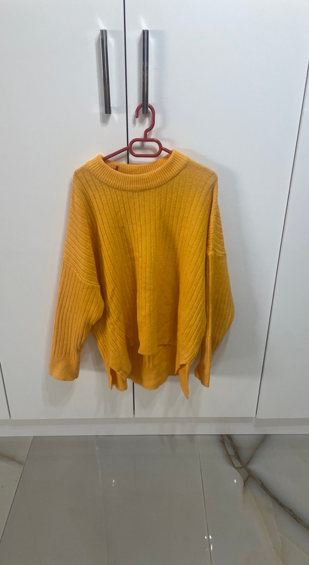 Sarı örgü kadın triko kazak, uzun kollu ve bisiklet yaka detaylıdır. Salaş kesim ve normal boydadır, günlük sokak stili için uygundur. M beden