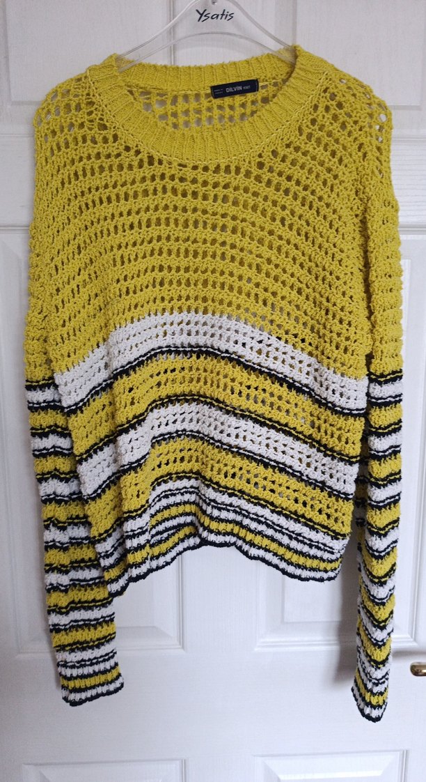 Sarı örgü kadın kazak, bol kesim, uzun kollu ve yuvarlak yaka. Beyaz ve gri yatay çizgilerle bohem tarzda, günlük kullanıma uygun.