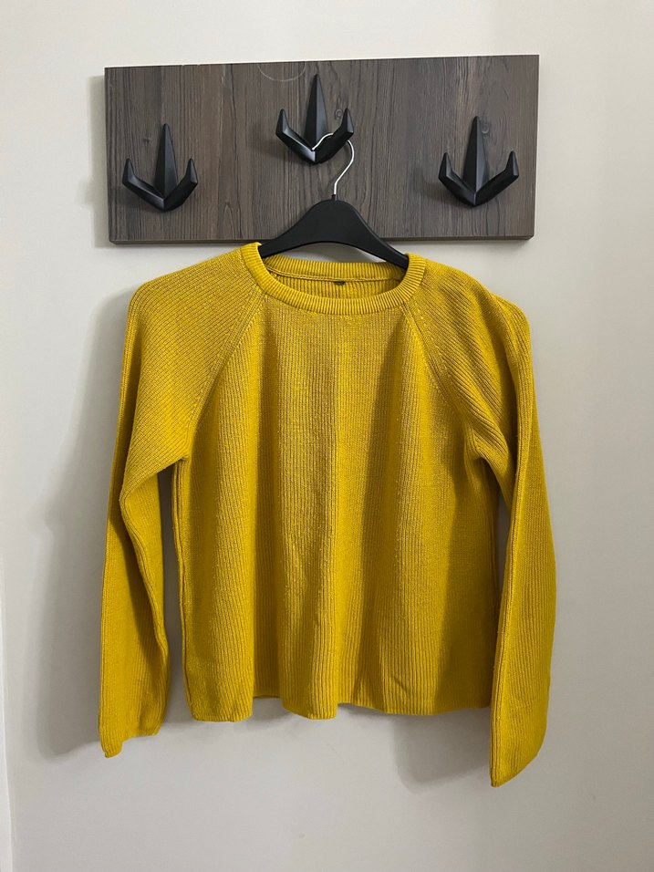 Sarı örgü kadın kazak, uzun kollu, yuvarlak yaka, yumuşak yün kumaştan, rahat kesim ve normal boyda günlük kullanıma uygun.