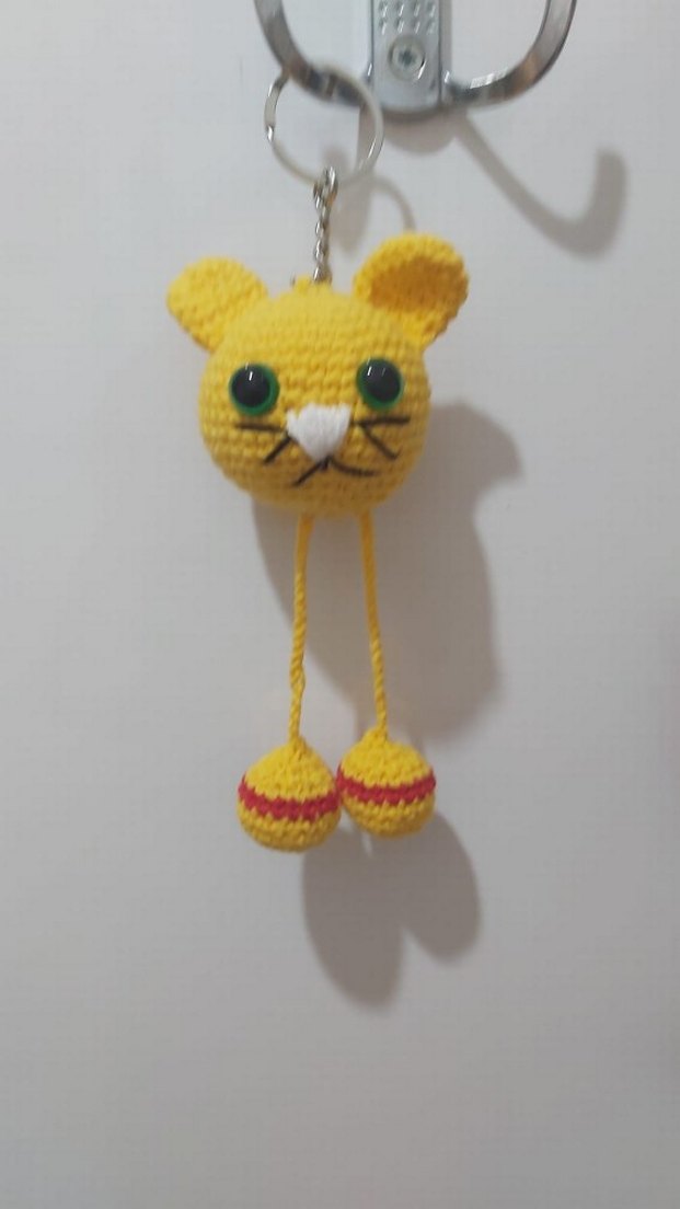 Sarı renkli, örgüden yapılmış kedi anahtarlık, sallanan bacakları ve yeşil gözleri ile renkli bir kedi aksesuarıdır.