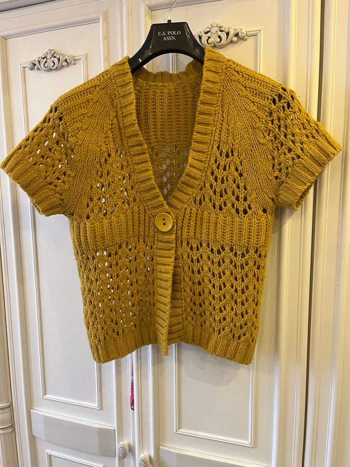 Koyu sarı, kısa kollu, V yakalı, örgü detaylı, rahat ve bohem tarzda, normal uzunlukta, dar kesim kadın hırkası.